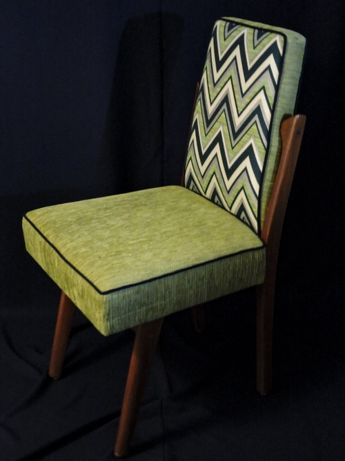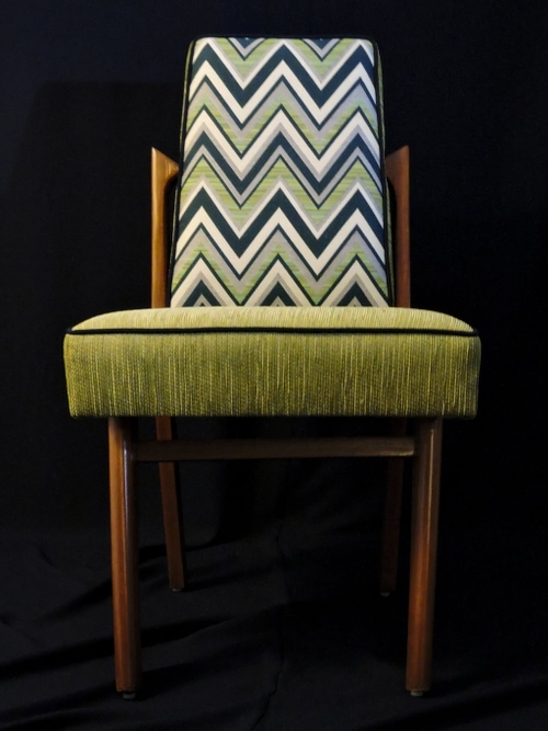 Rescatamos 3 sillas con la misma estructura, todas tenían diferente color de tapicería y estaban cubiertas con plástico transparente. Fueron tapizadas con tela importada en tonos verdes y se recuperó la madera de caoba original. Recordemos que en los años 60, colores como el verde y azul eran las tonalidades predominantes.