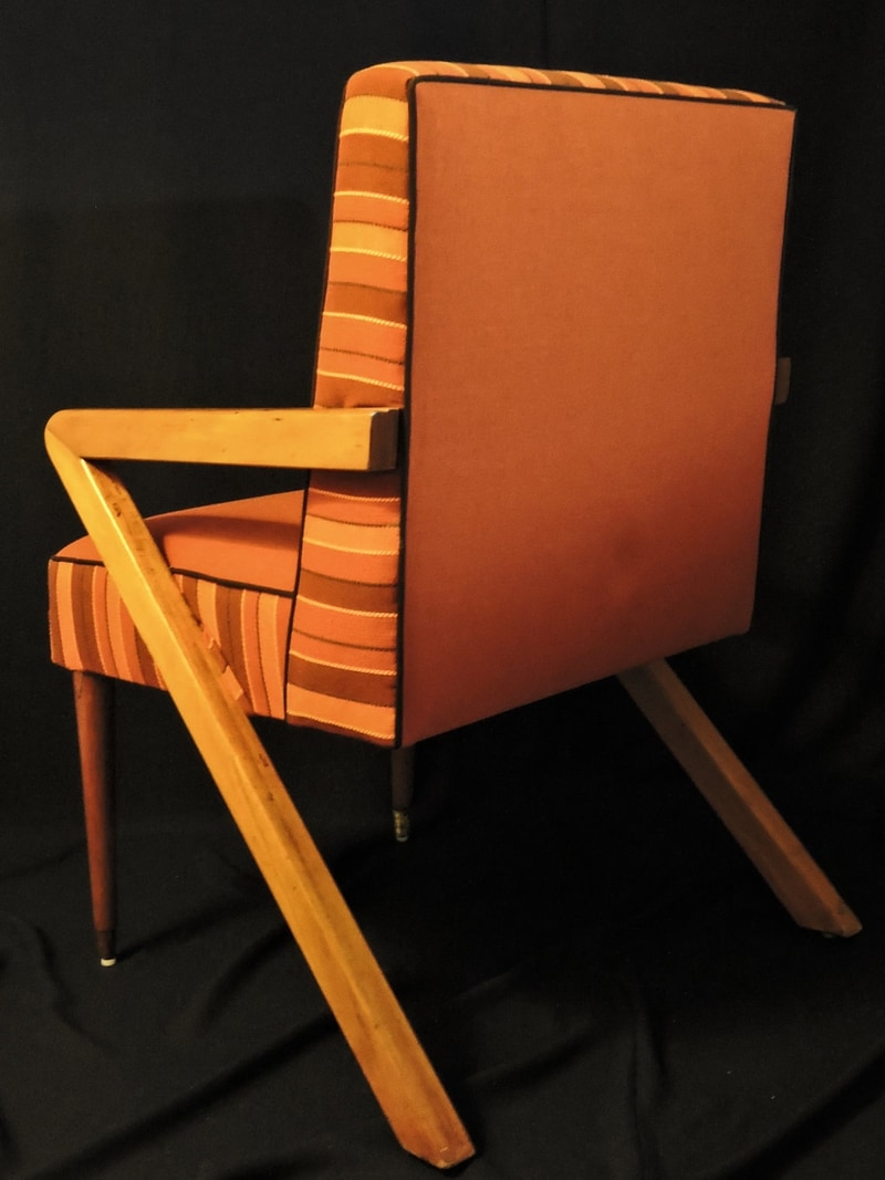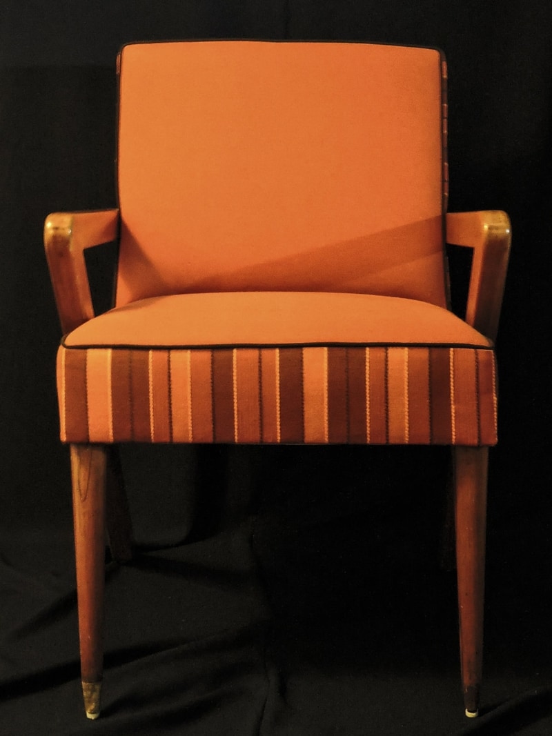 Correspondiente a la época de los años 60. Respetando siempre la forma original del mobiliario que restauramos, esta hermosa pieza fue tapizada con colores que hacen referencia a la época que pertenece pero con un toque actual. La madera de caoba original fue tratada para lucir como nueva.